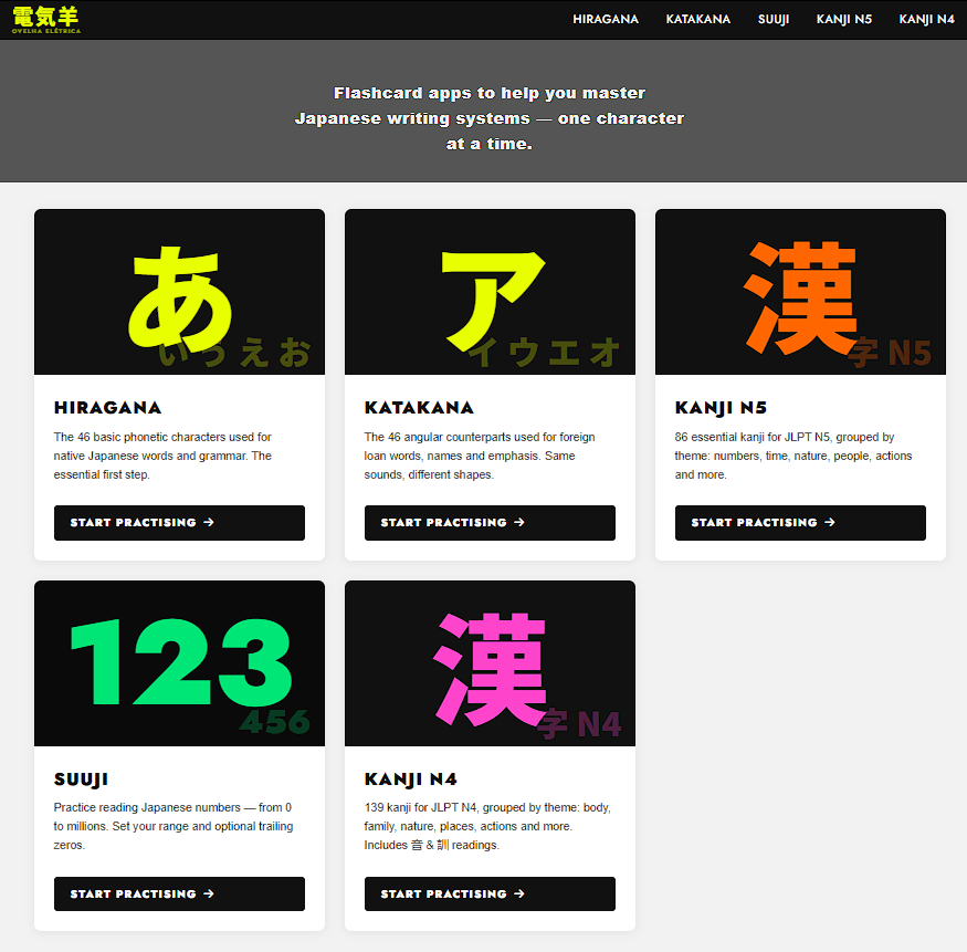 Longe da pretensão de ser um professor de japonês.. mas estou estudando. E gostaria de compartilhar uns mini-aplicativos que fiz para decorar as letras dos alfabetos japoneses. E também para aprender os números e uns kanji básicos. São 5 pequenos apps que falam para você qual é a letra ou número nos alfabetos hiragana, katakana e kanji. Aperta play e ele vira um slideshow automático ou controle pelas setas do teclado a troca das letras. Vai na fé: